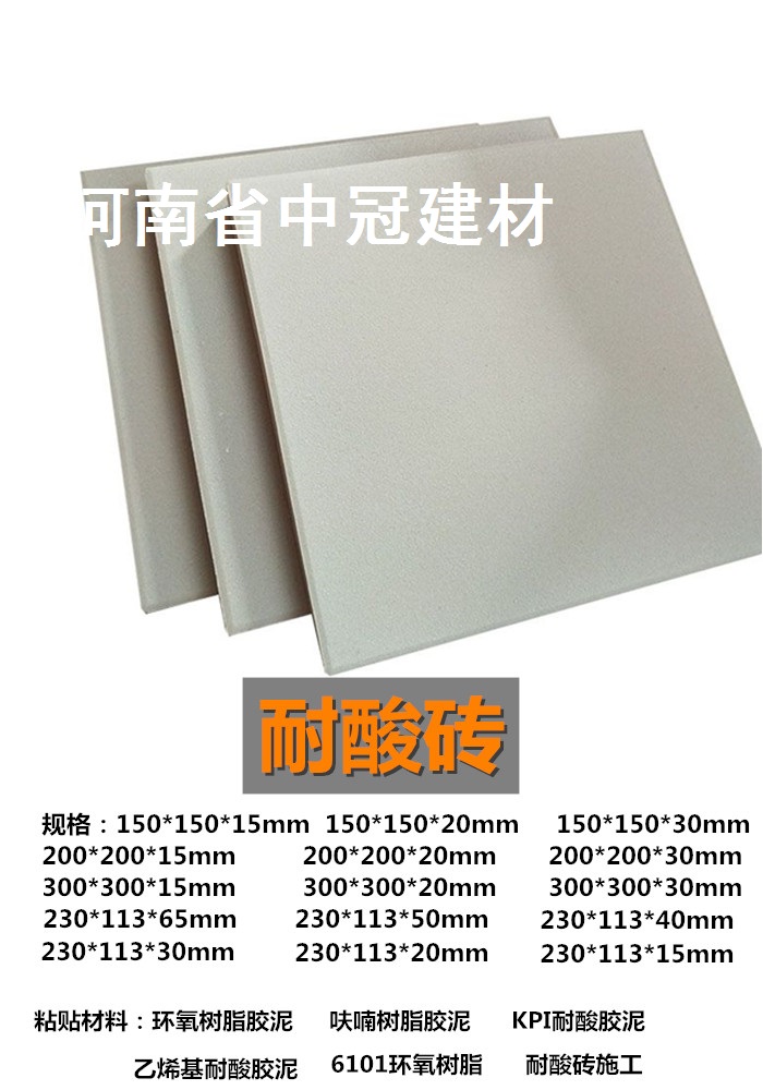 耐酸磚瓷磚是以石英、長石、粘土為主要原料,經(jīng)高溫氧化分解制成的耐腐蝕材料,耐酸解度高、吸水率低,在常溫下不易氧化,不易被介質(zhì)污染等性能,除-及熱磷酸外,對溫氯鹽水、-、---等酸類及在常溫下的任何濃度的堿類,具有抗腐作用。耐酸磚防腐 耐酸,防腐行業(yè)所需要的建筑材料,耐酸磚產(chǎn)品在防腐行業(yè)可使用墻面、地面、塔、池、罐以及露天場地均可使用,耐酸磚使用的環(huán)境不同施工時(shí)使用的粘接材料也會有很大的區(qū)別,通常使用的粘接材料有環(huán)氧膠泥、---膠泥等,